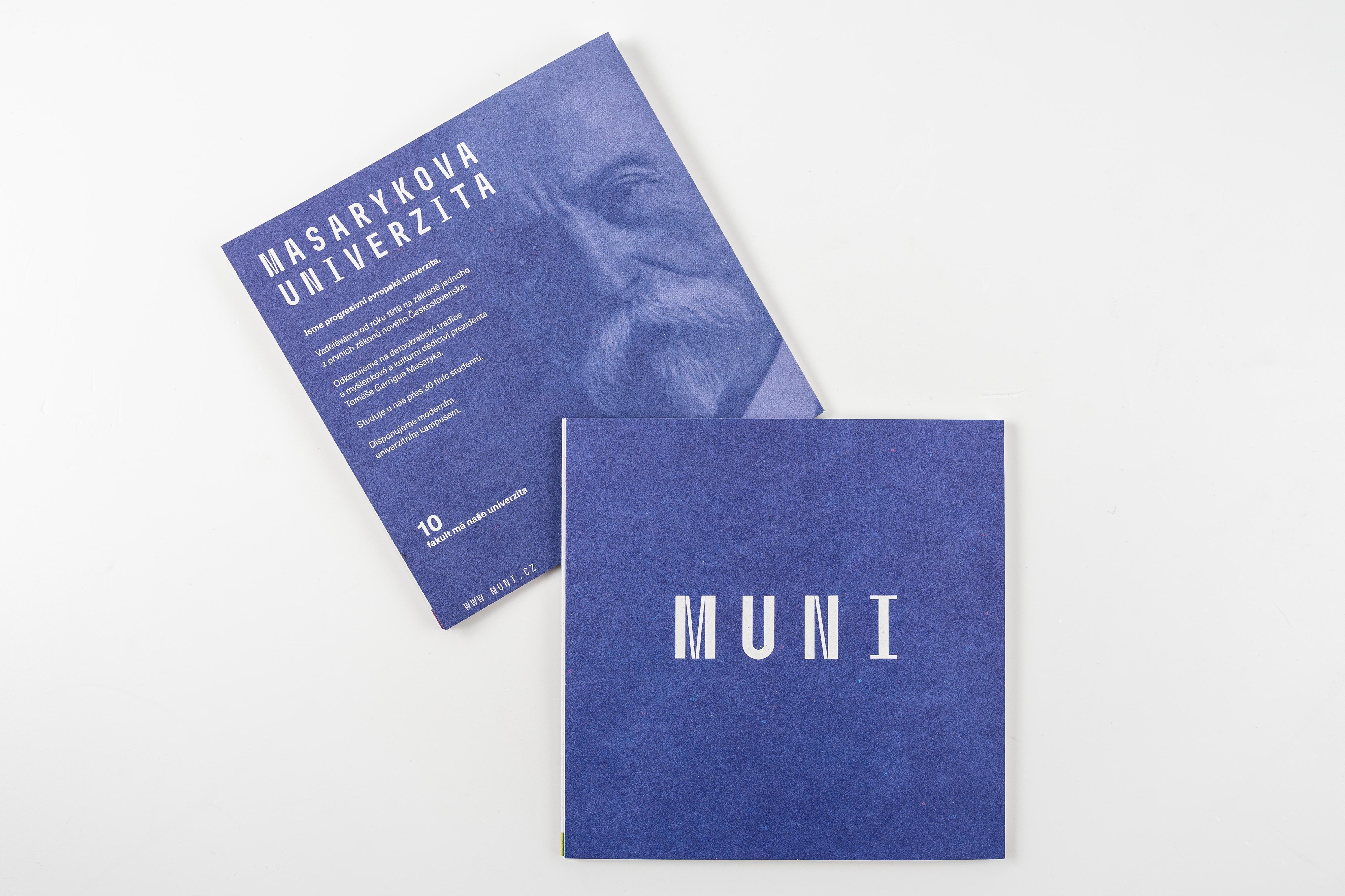 A folding leaflet made of hard paper, which offers a brief introduction to the faculties of Masaryk University.