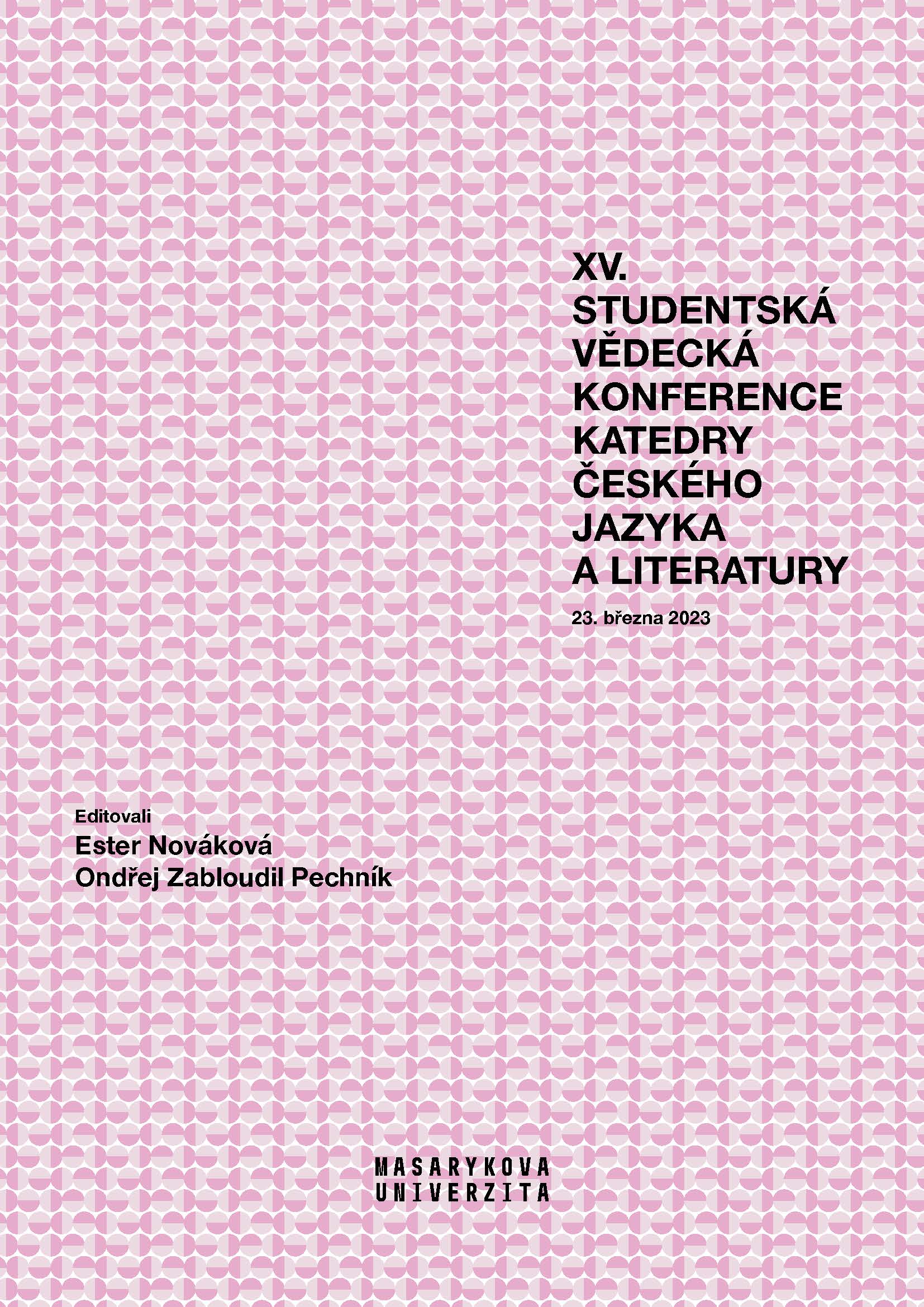 These collection of the XV. student scientific conference of the Department of Czech Language and literature from March 23, 2023, contains 15 articles by 15 researchers on linguistic and literary topics. It contains studies by Kristýna Zuzaňáková (The metaphors of everyday life), Iveta Dokoupilová (Carrying children in linguistics), Tereza Švandová (Czech Language as the basis of success or the Role of Czech for foreign language speakers), Radim Ošmera (Interlanguage theory in second language acquisition), Zuzana Procházková (Textbooks for pupils with different mother tongue at the second level of primary school), Aneta Čermáková (Strengths and limitations of corpus analysis of bilingual material), Petra Fojtíková (Literacy and literacy in literary education classes), Miroslav Jindra (Conclusion to the research on children’s identification with literary works and theatre performances), Marie Pavelková (The figure of the child-stranger in Alena Ježková’s Dragon soup), Magdalena Lípová (The dog hero as a guide on the way to identity formation and interpersonal relationships in selected stories for children and youth), Klára Březinová (Marian mirroring), Dominika Papíková (Internal subjects in Petra Soukupová’s books To the sea and The best for all), Ondřej Zabloudil Pechník (The thematization of natural nations in Czech literature after 2000 in retrospect), Tereza Homolová (The theme of music in the poetry of Vít Slíva) and Tereza Pořízková (Above aspects of the novel by E. M. Forster).